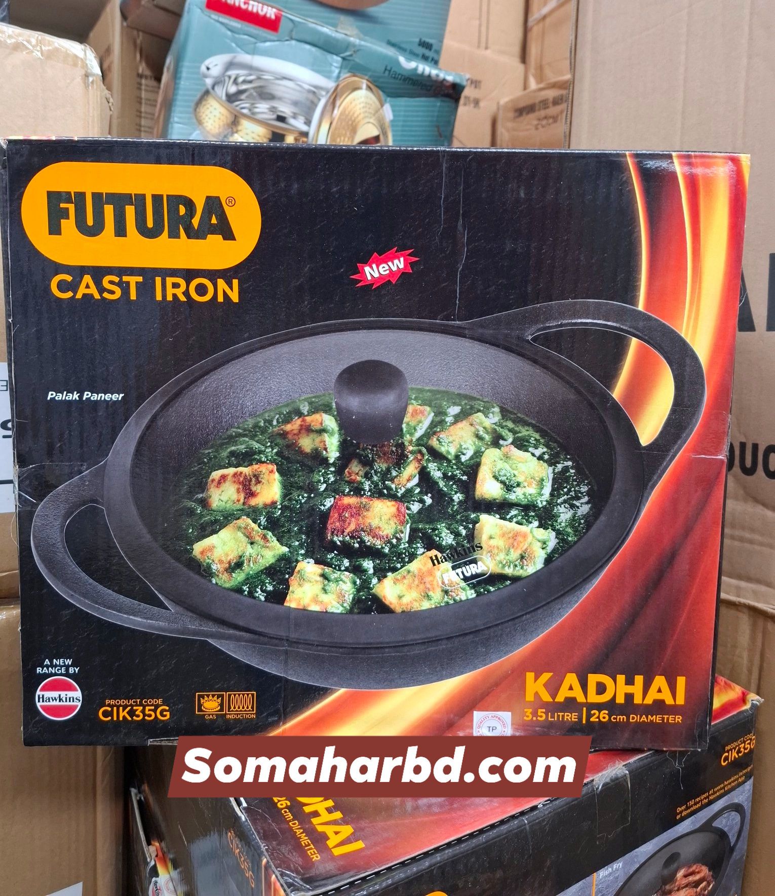 Hawkins Futura 3.5 Litre Cast Iron Kadhai, Naturally Nonstick Cast Iron Kadai with Glass Lid, Cast Iron Cookware for Kitchen, Black (CIK35G).