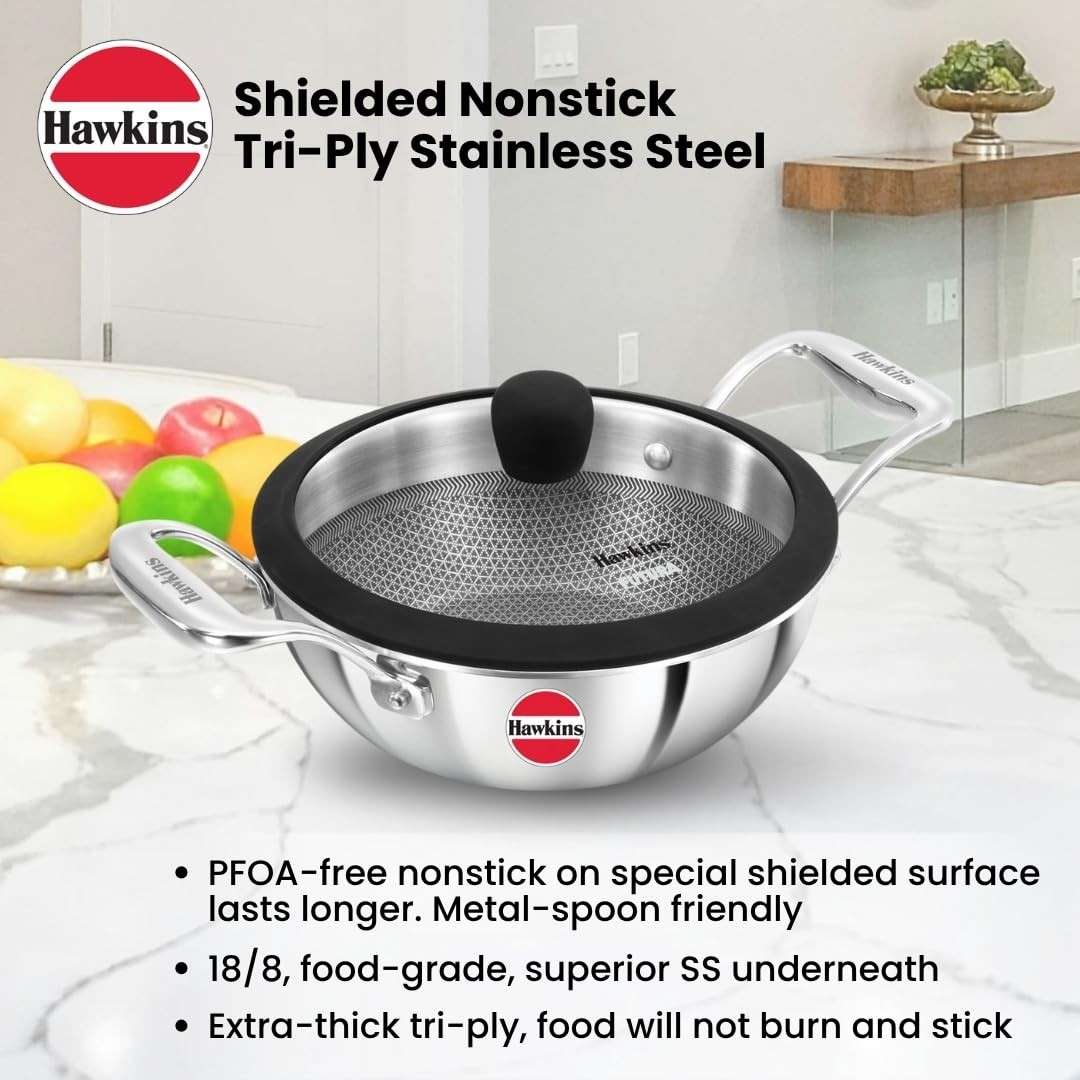 Hawkins Pro 3.5 Litre Shielded Nonstick Triply Deep-Fry Pan, Kadhai with Stainless Steel Handles and Glass Lid, Silver (PSNK35G), 26 cm.